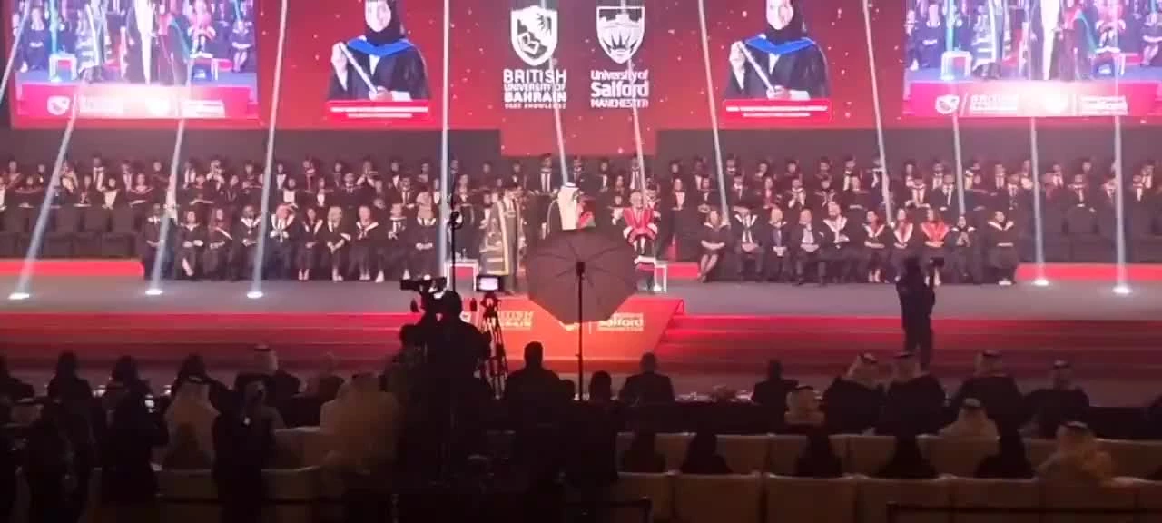 دانشجوی بحرینی در مراسم فارغ التحصیلی خود در یکی از دانشگاههای انگلیس پرچم فلسطین را روی شانه خود گذاشت