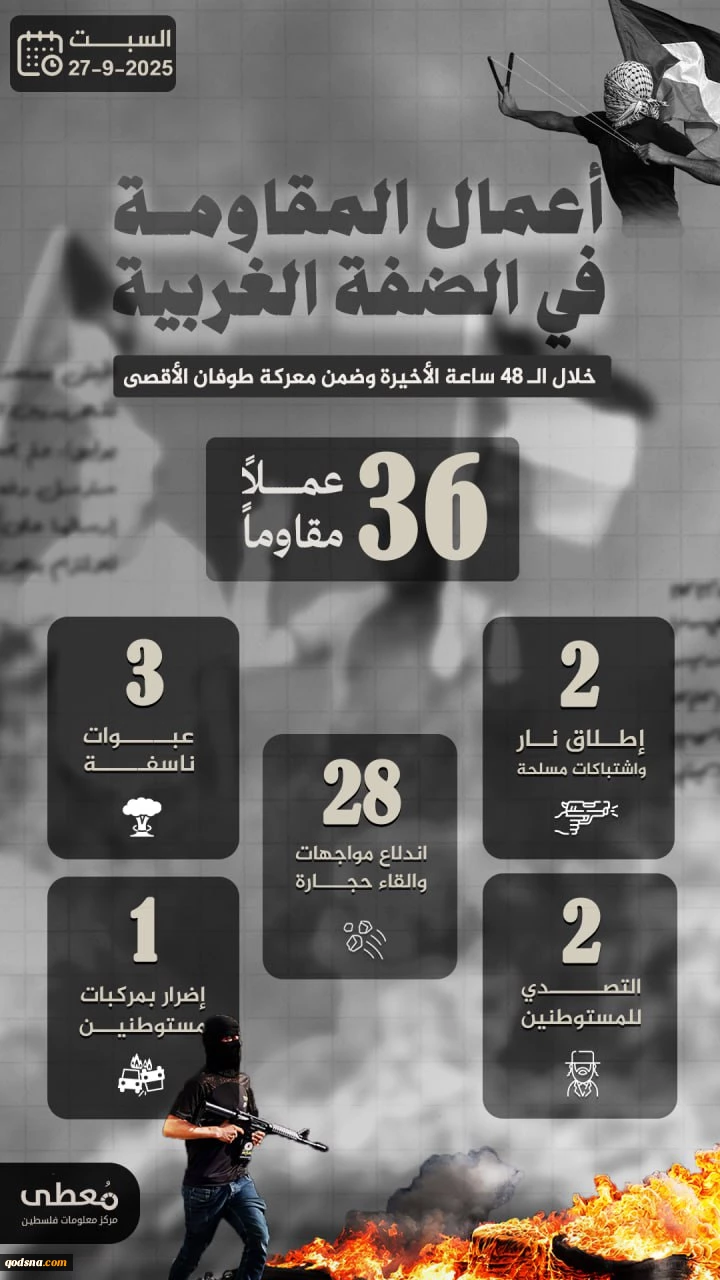امتیاز دهید : مرکز پژوهشی معطی منتشر کرد؛ 36 عملیات مقاومتی در کرانه باختری در 48 ساعت اخیر+ عکس 2 یکشنبه 6 مهر 1404 ساعت 11:26