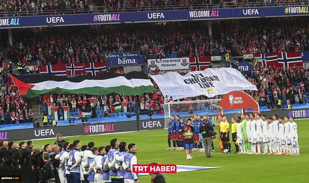 تصاویری از همبستگی با فلسطین در جریان بازی تیم ملی فوتبال نروژ با رژیم صهیونیستی در چارچوب بازی‌های مقدماتی جام جهانی ۲۰۲۶