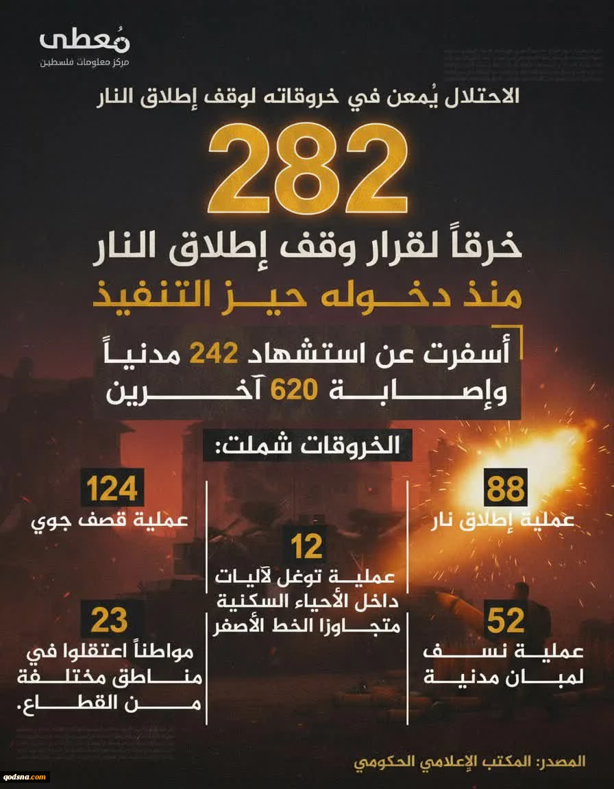 امتیاز دهید : مرکز پژوهشی آماری معطی گزارش داد؛ ۲۸۲ مورد نقض آتشبس در غزه از زمان اجرایی شدن آن 2 چهارشنبه 21 آبان 1404 ساعت 14:54