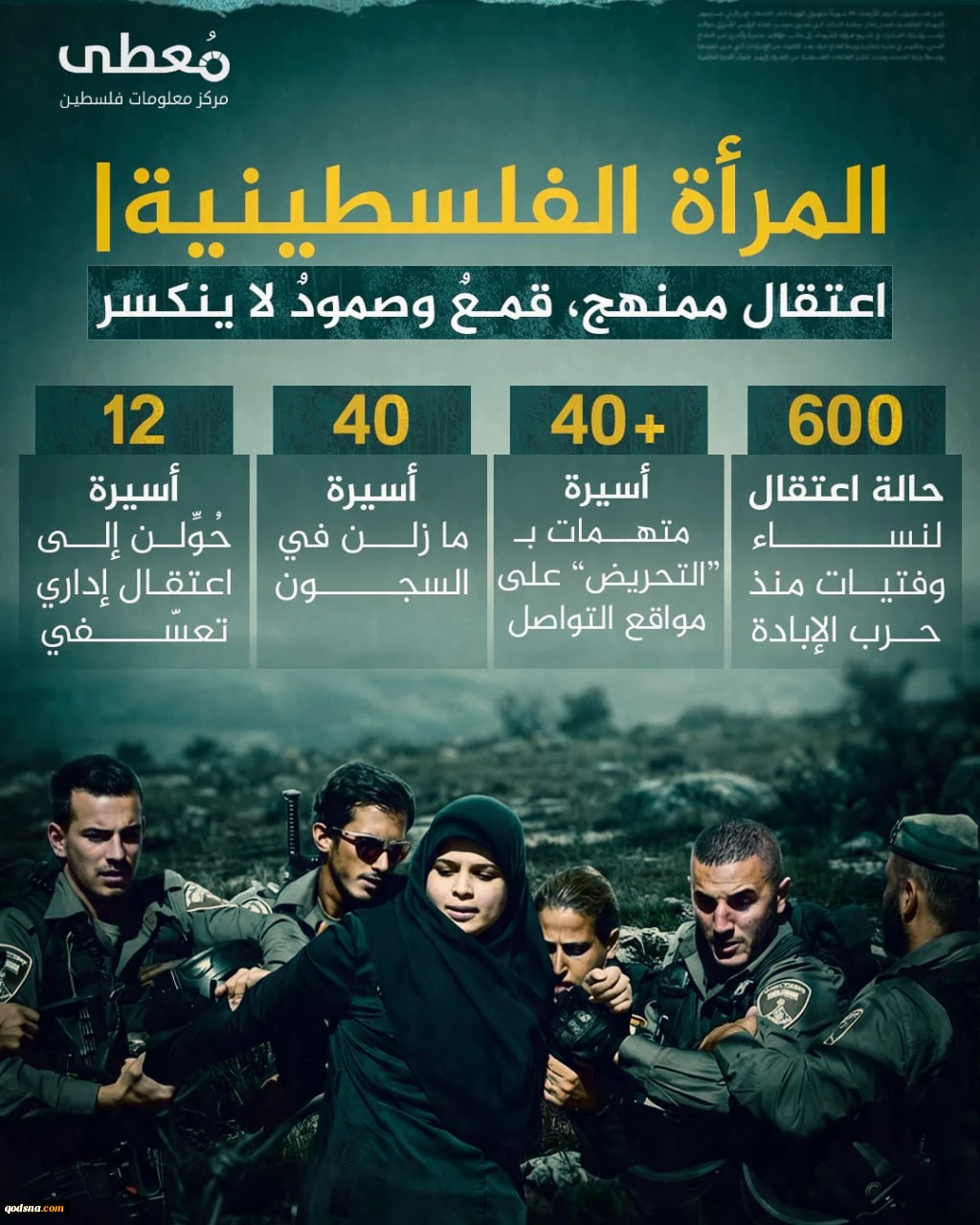 مرکز داده‌های فلسطین «معطى» اعلام کرد که نیروهای اشغالگر اسرائیلی از آغاز جنگ نسل‌کشی در نوار غزه حدود ۶۰۰ زن و دختر فلسطینی را بازداشت کرده‌اند؛