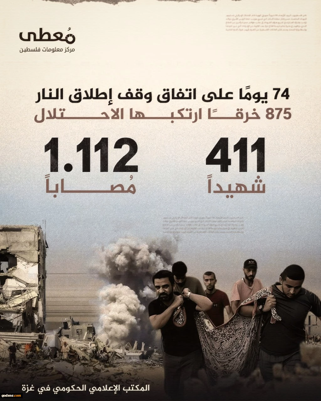 مرکز آماری پژوهشی معطی گزارش داد؛ ۷۴ روز پس از آتش‌بس در غزه؛ 875 مورد نقض توافق و 411 شهید فلسطینی 3